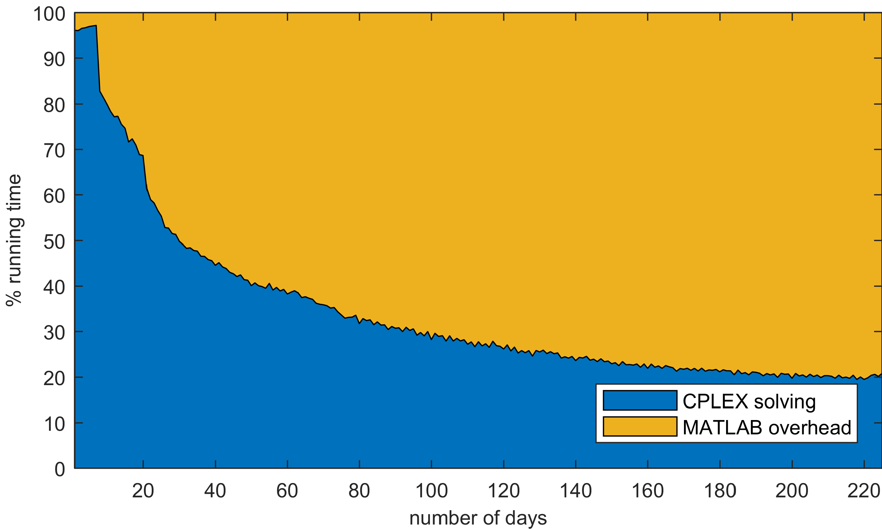 Bitte schön. Beim Einsatz von CPLEX nimmt der Prozentsatz der zur Lösung unseres Minimierungsproblems benötigten Laufzeit mit zunehmender Problemgröße rasch ab. Ist das nicht wunderschön? Aber auch frustrierend, da es keinen offensichtlichen Weg gibt, den Matrix-Manipulationsmechanismus von MATLAB zu beschleunigen. Schließlich habe ich so viel von meinem MATLAB-Know-how genutzt, um Schleifen zu vermeiden und wo immer möglich native Funktionen zu verwenden. Doch es ist MATLAB, nicht der Solver, der zu unserem Engpass geworden ist.