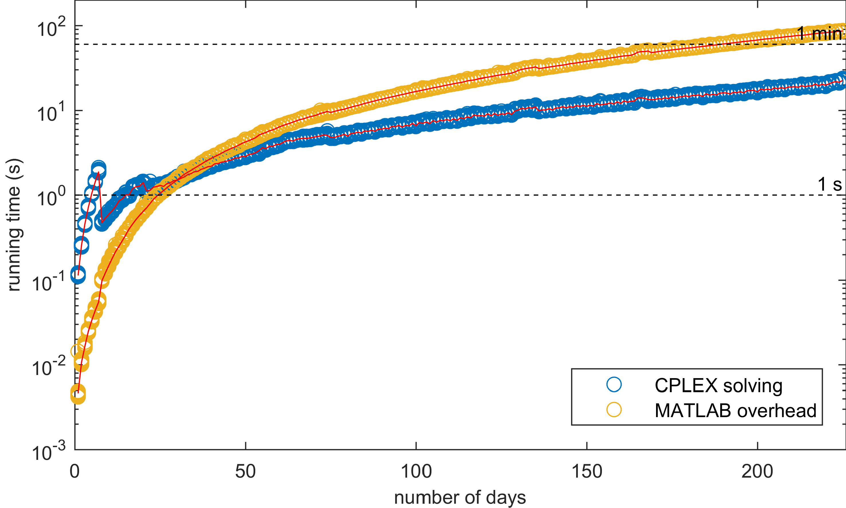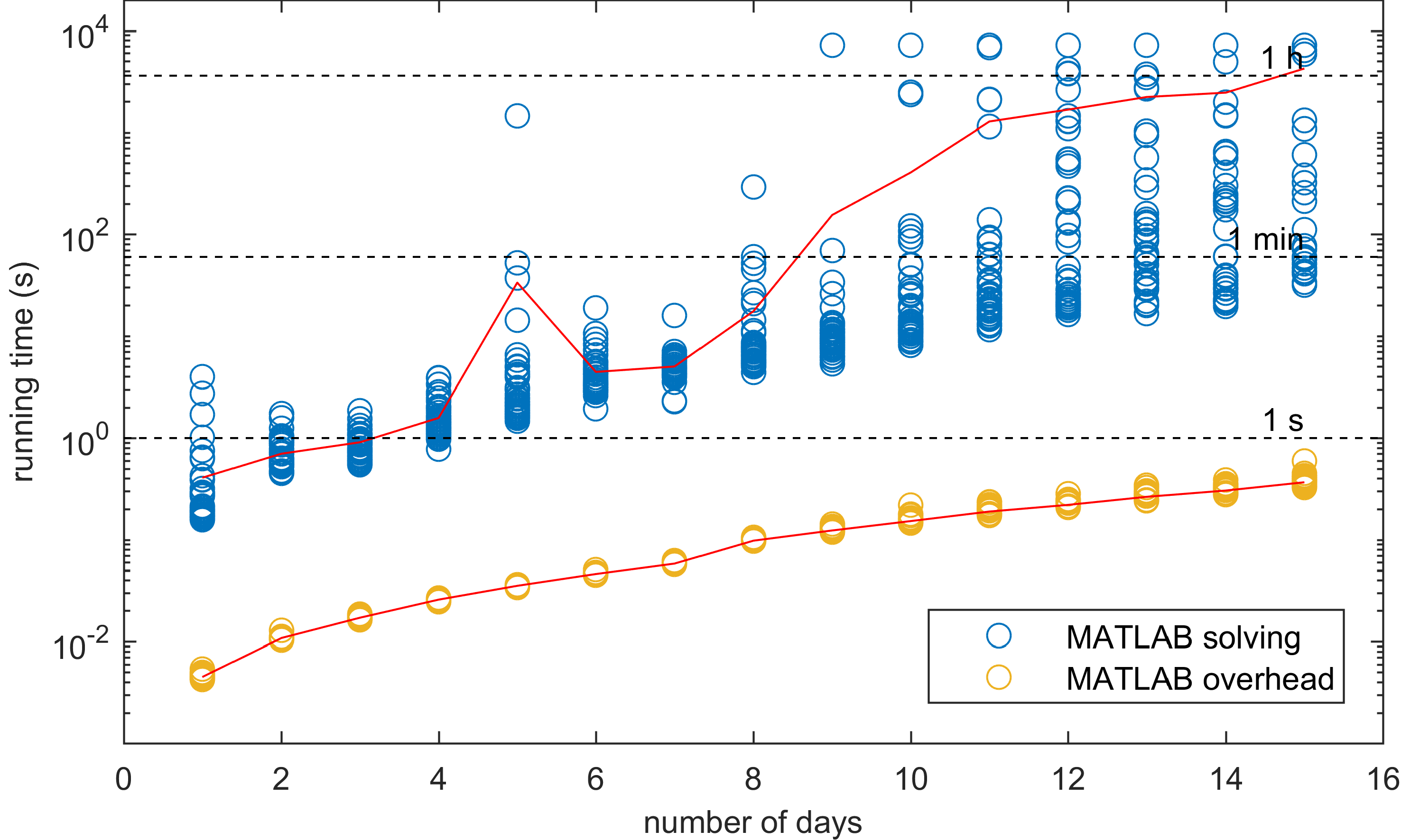Die Ergebnisse zeigen, dass die durchschnittliche Zeit, die wir für die Lösung unseres Problems benötigen, die durchschnittliche Overhead-Zeit bei weitem übertrifft. Man könnte daher glauben, dass MATLAB ziemlich gut darin ist, elementare Aufgaben zu erfüllen. Denn Probleme, deren Lösung zwei Stunden beanspruchte, konnten in weniger als einer Sekunde aufgesetzt werden. Aber wie man sieht, ist MATLAB ziemlich langsam, weshalb ich anfangs nur 50 Wiederholungen von maximal 15 Tagen auswerten ließ. CPLEX hingegen war viel schneller, so dass ich anfing, seinen BILP (Binary Integer Linear Programming) Solver zu analysieren und nach ein paar Tagen die Ergebnisse zu sammeln.