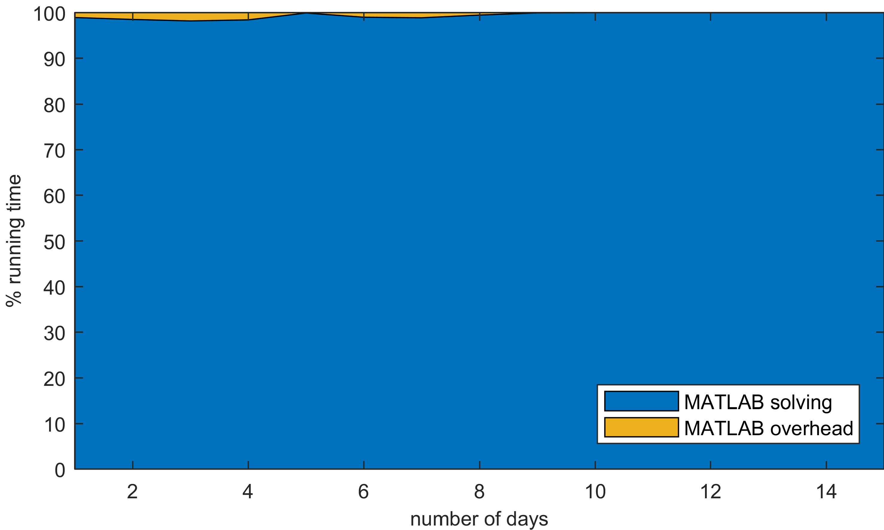 Um zu untersuchen, wie viel Zeit für die Vorbereitung und Lösung unseres Minimierungsproblems benötigt wird, habe ich meinen Profiling-Code angepasst und den MILP (Mixed Integer Linear Programming) Solver in MATLAB neu gestartet. Die Ergebnisse sehen wie folgt aus:
